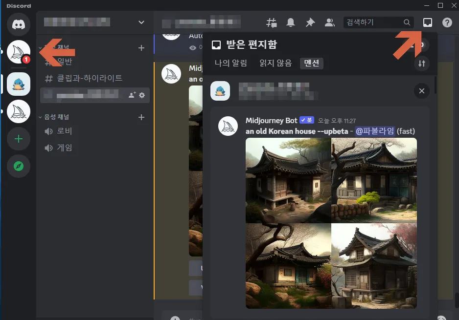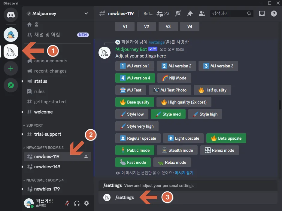 처음 디스코드 접속하게 되면 좌측 미드저니 서버 클릭.